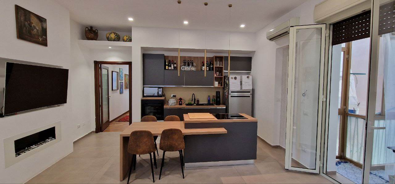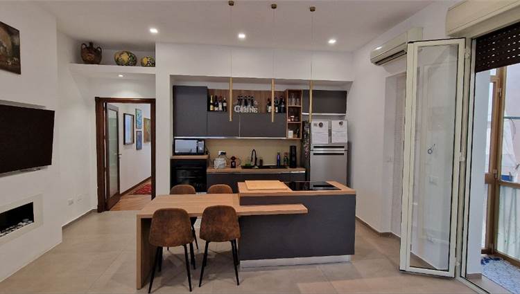 Cucina-soggiorno openspace con accesso a balcone parzialmente verandato (uso lavanderia)